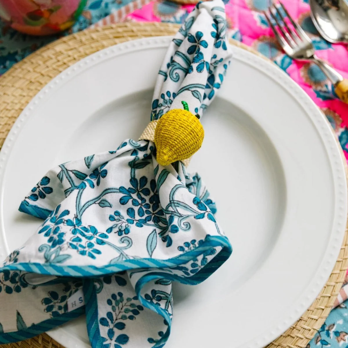 Make your meals extra festive with our exclusive blockprint scalloped napkins. Handmade in India , the charming color combo and the striped scalloped trim make a bold statement. By opting for sustainable table linens over disposable, we can help cut down on waste and support an age-old craft by artisans in Jaipur.